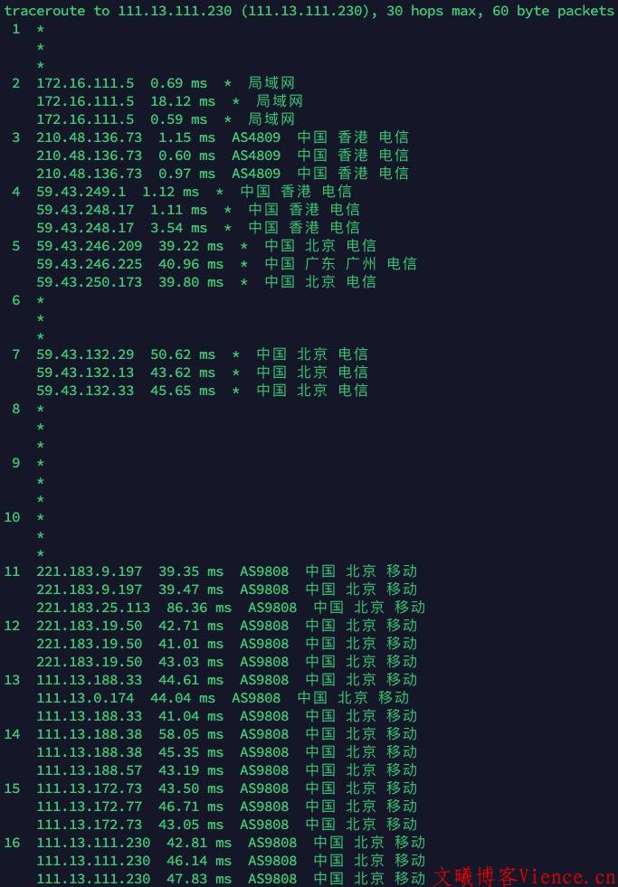 通过观察路由,可以看到江苏宿迁移动是走广州移动的出海口,到达香港,是直连线路。