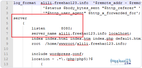 4、阿里云服务器也是安装了LNMP,同样也是创建一个虚拟机,绑定的域名也是alili.freehao123.info,找到该域名conf这个文件,是改动的就是listen ,其它的都是一样的。