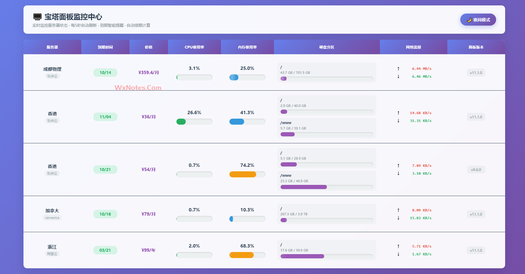 AI编写的一个服务器监控源码 简介:AI编写的一个服务器监控源码接口使用的宝塔面板api,被监控机器需要安装宝塔面板将压缩包上传至站点解压,修改“servers.php”内链接信息即可图片:[NeadPay]...