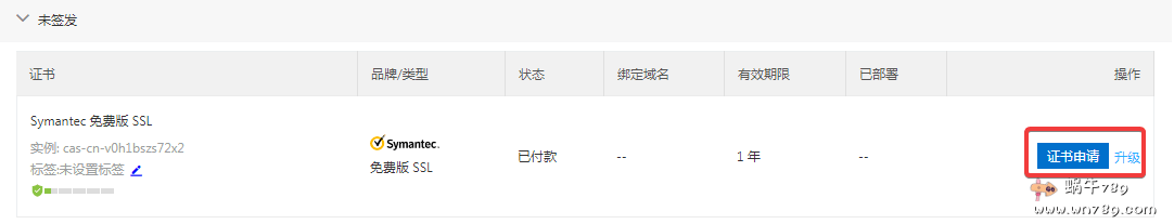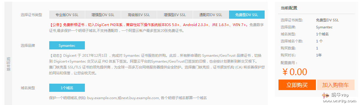 如果需要免费的SSL证书,除了上述的宝塔Linux面板可以一键免费申请外,目前腾讯云、阿里云均有免费1年的SSL证书可以申请,下面重点说下腾讯云吧。点击这里进入腾讯云免费SSL证书申请页面。点击“申请免费证书”,选购一款免费型DV SSL。