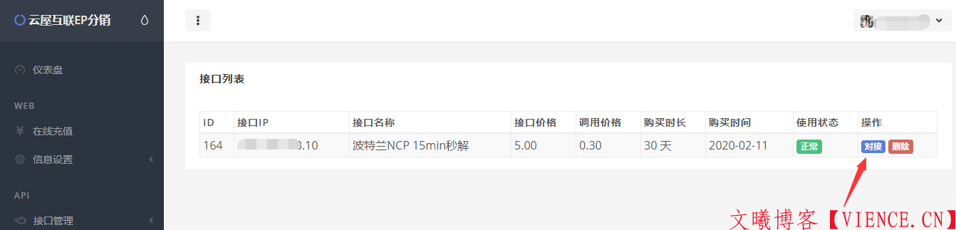 购买后会自动跳转至 接口列表 点击旁边 对接 按钮,这里随便选了个做测试