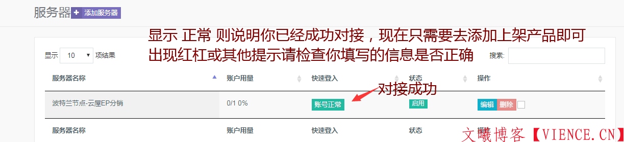返回服务器列表查看对接状态