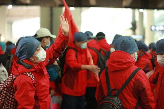 2月13日下午,武汉天河机场航站楼外,福建省立医院医疗队队员排队等待登上大巴车。