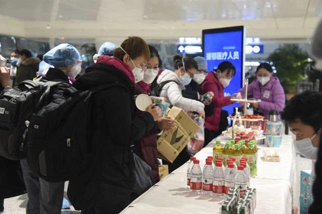 2月13日下午,武汉天河机场设置了“医疗人员休息区”,为医疗人员准备了饮料和食品。