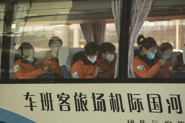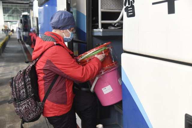 2月13日下午,武汉天河机场航站楼外,江苏省苏北人民医院医疗队坐上大巴车。