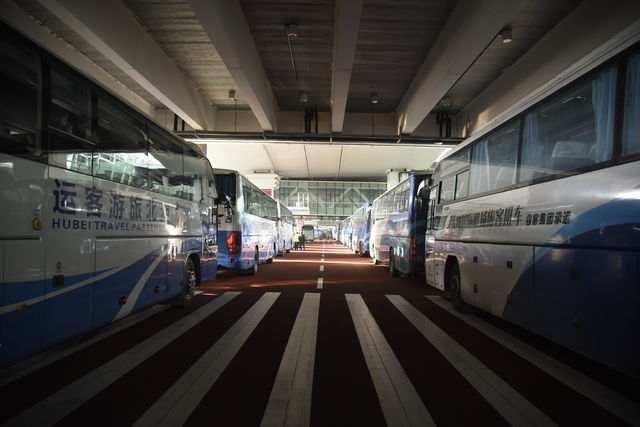 2月13日下午,武汉天河机场航站楼外停满了前来接医疗队伍的大巴车。