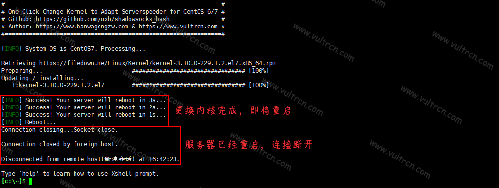内核更换完成后,会进行重启操作,这样才能成功更换内核,如下图所示。