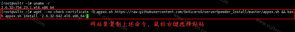 wget --no-check-certificate -O appex.sh https://raw.githubusercontent.com/0oVicero0/serverSpeeder_Install/master/appex.sh && bash appex.sh install '2.6.32-642.el6.x86_64'