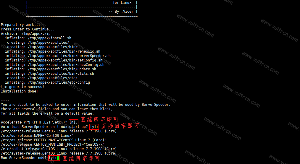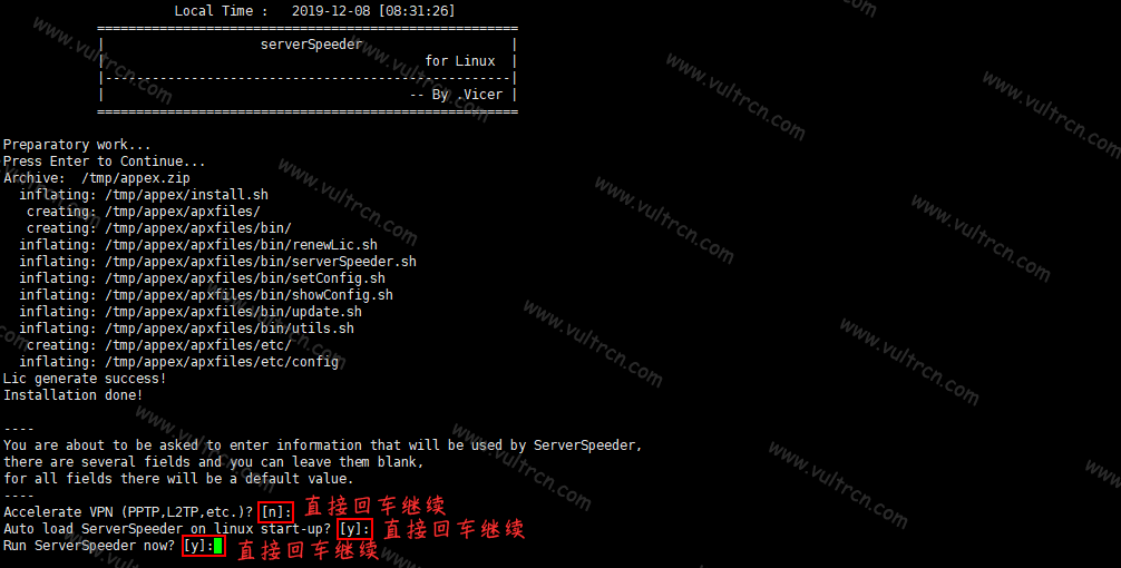 回车继续后系统会自动开始安装锐速,同时在安装过程中会先后要求我们设置锐速的三项信息。按照下图提示,我们每次都直接回车继续即可。