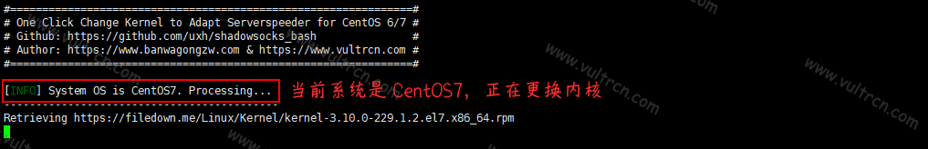 回车后系统会自动下载内核更换脚本并执行。按照下图提示,我们可以看到当前系统为 CentOS7 X64,同时脚本正在更换内核。