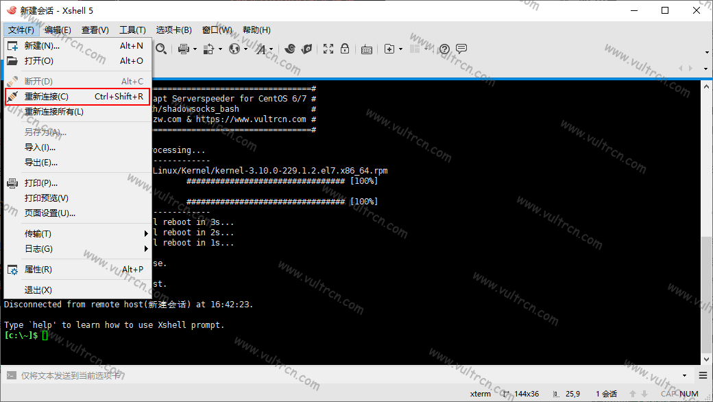 服务器重启大概会耗时 2~3 分钟,我们耐心等待即可。按照下图提示,我们首先点击 Xshell 菜单中的文件,然后再点击重新连接按钮重新连接服务器。