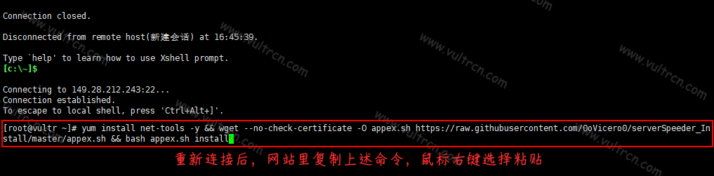 按照《Windows 使用 Xshell 软件连接 Vultr VPS 教程》连接好服务器。按照下图提示,我们首先复制下列命令: