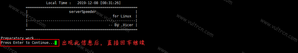 回车后系统会自动下载锐速安装脚本并执行。按照下图提示,等待出现“Press Enter to Continue...”后,我们直接回车继续即可。
