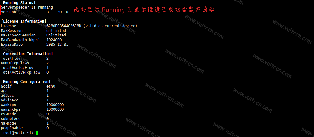 设置完三项信息完成后,系统会完成锐速安装并输出锐速的运行状态。按照下图提示,当出现红框内信息时说明锐速已完成安装并开机自启动。
