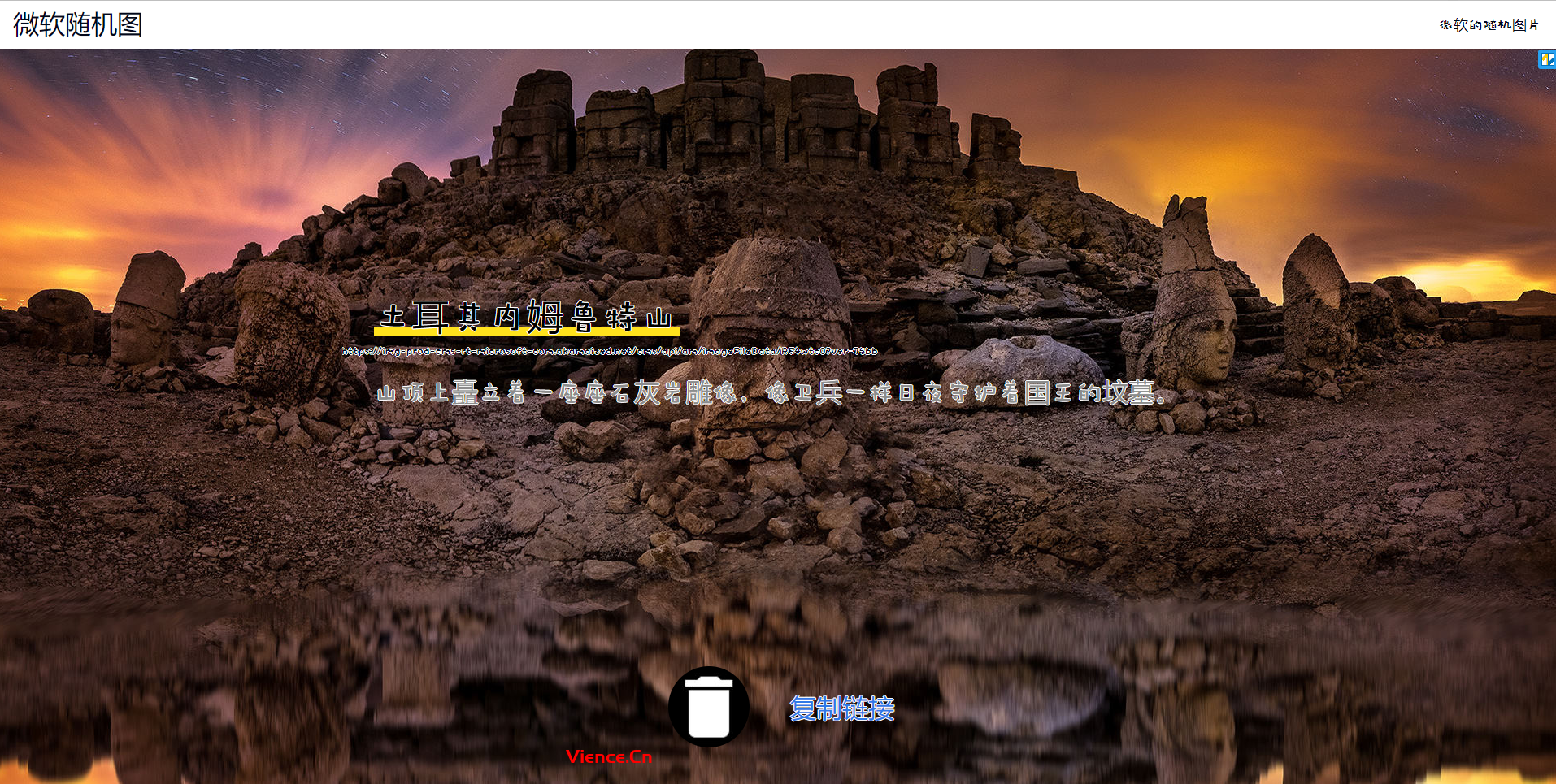 前一久不是在我的api站点新开发了个微软的随机图api嘛,于是我就想做一个可以切换的随机图网站,但做了又发现没什么用,全部分享出来吧。 简单介绍下,点击我的头像会切换下一张,点击复制链接会复制图片的url网址,最终图片是对接的是我的api站点(api.vience.cn)。 另外pc、手机端自适应,...