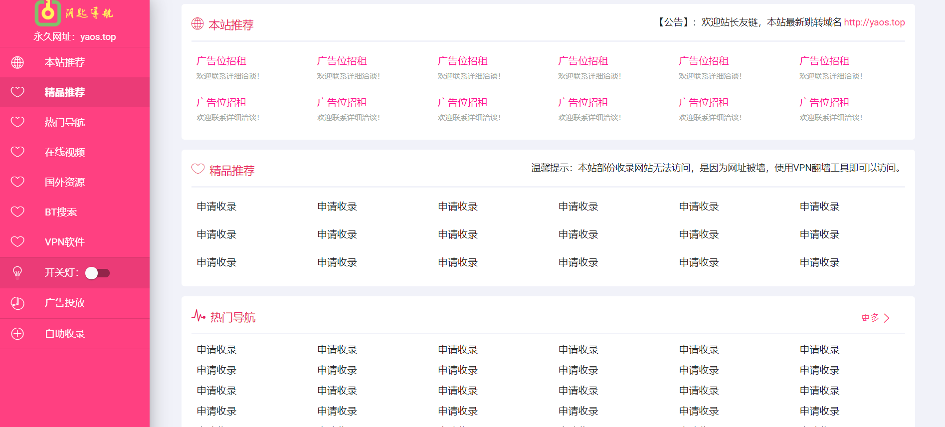 钥匙导航最新自动收录导航批量检查反链 系统简介程序pc 手机双端自适应后台 网址/admin使用说明钥匙主题,基于flkc主题重写,功能:自动收录,自定义排序,自定义颜色,批量检测1、解压把 程序 文件夹里的文件上传到根目录 PHP版本>=7.02、把 数据库文件夹里的 yaos_top.sql 恢复到数据库 3、修改根目录下 conf...