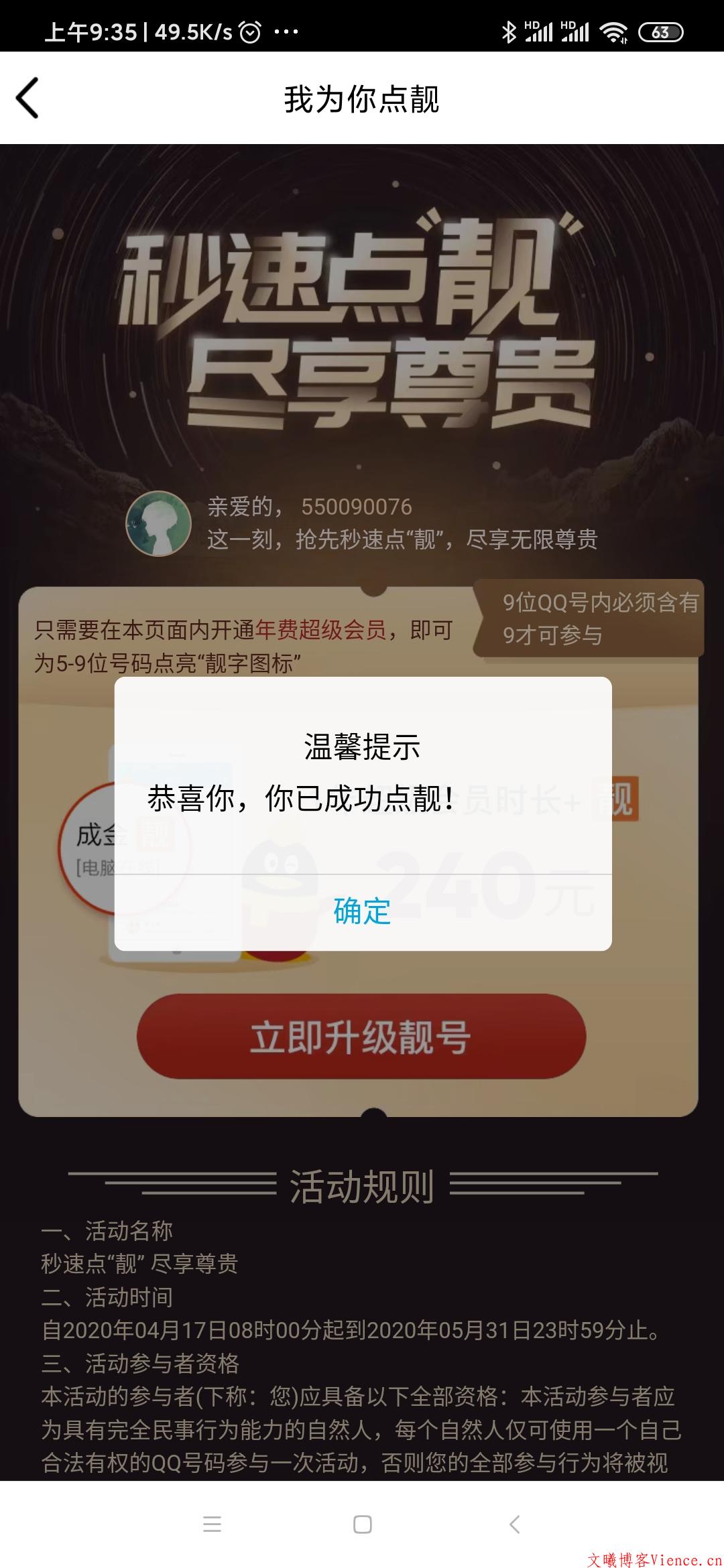 开1年超级会员秒变QQ靓号 仅限5~9位数QQ才可以有资格只需在本页面支付1年QQ超级会员,即可升级靓号图标截止日期:2020.4.17~2020.5.31活动地址:https://m.vip.qq.com/clubact/2019/lightliang/index2.html...