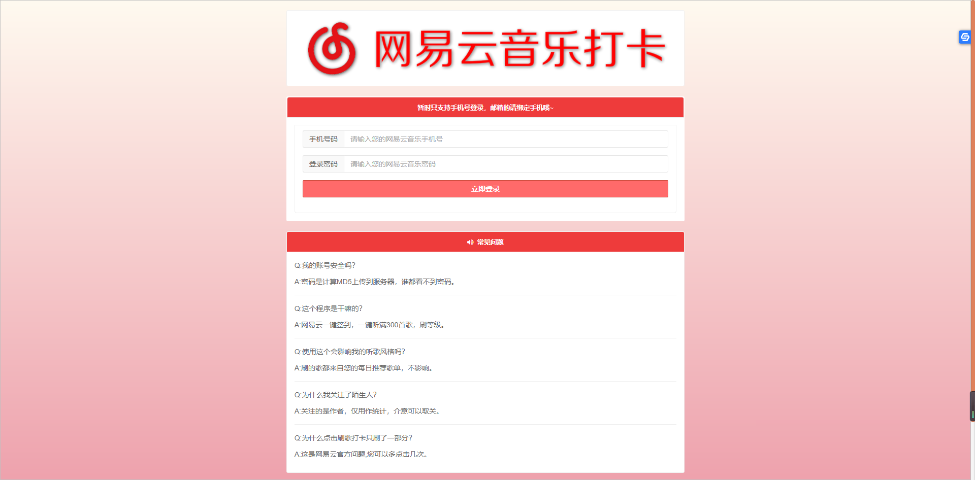 【源码分享】网易音乐一键签到打卡网站源码 网易音乐一键签到打卡源码 非常好用。Q:我的账号安全吗?A:密码是计算MD5上传到服务器,谁都看不到密码。Q:这个程序是干嘛的?A:网易云一键签到,一键听满300首歌,刷等级。Q:使用这个会影响我的听歌风格吗?A:刷的歌都来自您的每日推荐歌单,不影响。Q:为什么我关注了陌生人?A:关注的是作者,仅用...