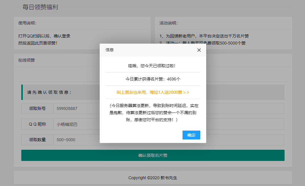 QQ名片赞互赞宝-免授权 源码说明:源码不用授权,网上的大多数都是需要授权的,我测试了一下可以用,这个东西是完全可以自己做一个第三方的,因为数据都是互相请求的,里面我专门加了一个广告的页面,你们可以自行添加广告。网站截图:下载地址:https://www.lanzous.com/i9t9gqj...